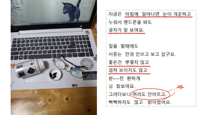 아침에 일어나시면 눈이 뿌옇게 보여서 화장실을 가거나, 스마트폰 및 컴퓨터 등등 어떤 걸 보든지 선명하게 보이지 않는다고 하세요. 게다가 출근하고 나서 서류를 보고 환자 체크를 해야되는데 점심이 될때까지 약간 뿌연 현상이 나아지지 않아 매일 불편하다고 하세요.